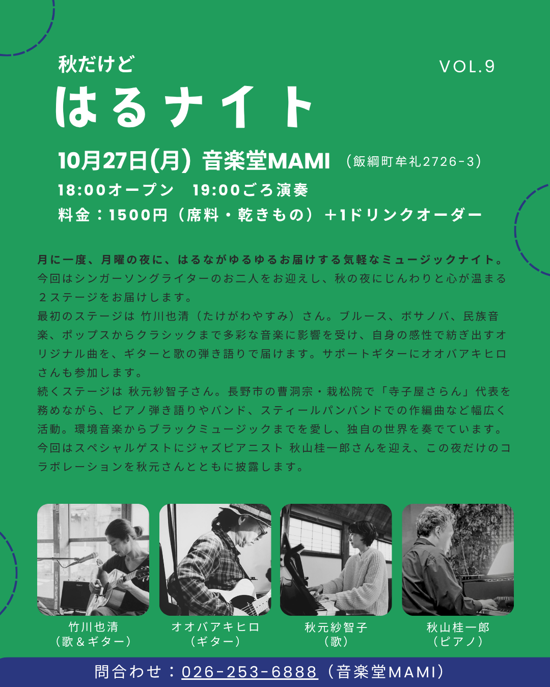 飲食メニューについて | 1ドリンク制 ご利用人数×1,500円いただきます。 (ドリンクはビール、サワー、ソフトドリンクからお選びいただけます) 夜の部では食べ物、飲み物の持ち込みはできませんので、追加ドリンク、食事メニューのご注文をお願いします。 ディナー付きライブの場合、打ち合わせのうえ10日前までにご予約お願いいたします。 |